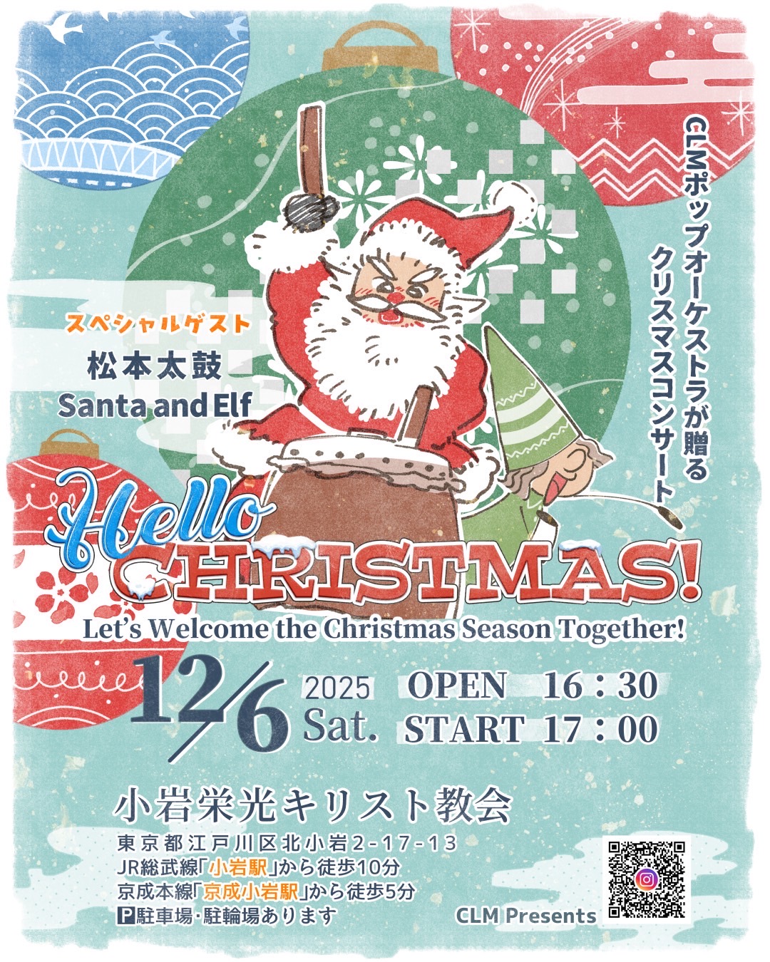12.6. open 16:30- start 17:00- “Hello CHRISTMAS!” CLM pop orchestra with special guest 松本太鼓, Santa and Elf